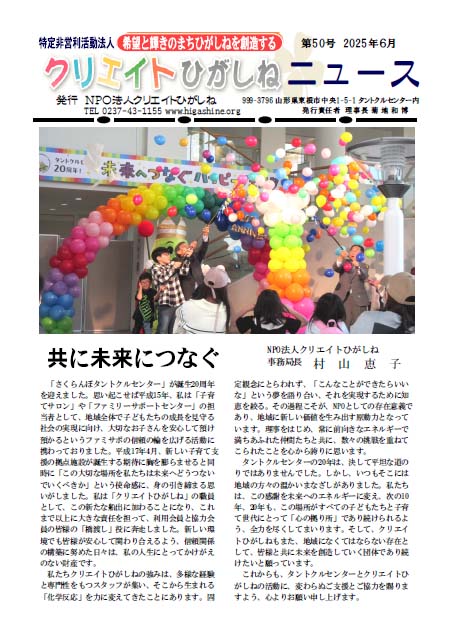 共に未来につなぐ 「さくらんぼタントクルセンター」が誕生20周年を迎えました。思い起こせば平成15年、私は「子育てサロン」や「ファミリーサポートセンター」の担当者として、地域全体で子どもたちの成長を見守る社会の実現に向け、大切なお子さんを安心して預け預かるというファミサポの信頼の輪を広げる活動に携わっておりました。平成17年4月、新しい子育て支援の拠点施設が誕生する期待に胸を膨らませると同時に「この大切な場所を私たちは未来へどうつないでいくべきか」という使命感に、身の引き締まる思いがしました。私は「クリエイトひがしね」の職員として、この新たな船出に加わることになり、これまで以上に大きな責任を担って、利用会員と協力会員の皆様の「橋渡し」役に奔走しました。新しい環境でも皆様が安心して関わり合えるよう、信頼関係の構築に努めた日々は、私の人生にとってかけがえのない財産です。 私たちクリエイトひがしねの強みは、多様な経験と専門性をもつスタッフが集い、そこから生まれる「化学反応」を力に変えてきたことにあります。固定観念にとらわれず、「こんなことができたらいいな」という夢を語り合い、それを実現するために知恵を絞る。その過程こそが、NPOとしての存在意義であり、地域に新しい価値を生み出す原動力となっています。理事をはじめ、常に前向きなエネルギーで満ちあふれた仲間たちと共に、数々の挑戦を重ねてこられたことを心から誇りに思います。 タントクルセンターの20年は、決して平坦な道のりではありませんでした。しかし、いつもそこには地域の方々の温かいまなざしがありました。私たちは、この感謝を未来へのエネルギーに変え、次の10年、20年も、この場所がすべての子どもたちと子育て世代にとって「心の拠り所」であり続けられるよう、全力を尽くしてまいります。そして、クリエイトひがしねもまた、地域になくてはならない存在として、皆様と共に未来を創造していく団体であり続けたいと願っています。 これからも、タントクルセンターとクリエイトひがしねの活動に、変わらぬご支援とご協力を賜りますよう、心よりお願い申し上げます。 NPO法人クリエイトひがしね |